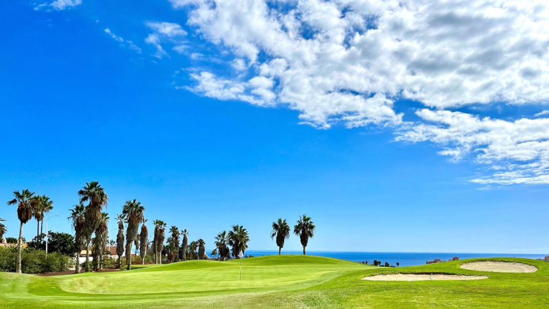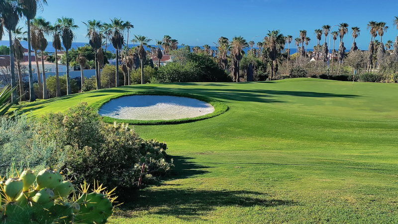 Golf del Sur är en 27-hålsbana belägen på södra Teneriffa, endast några minuter från flygplatsen och Atlantkusten. Banan är känd för sitt unika vulkaniska landskap där svarta lavabunkrar, palmer och kaktusar skapar en karaktäristisk och dramatisk inramning.De tre niohålsslingorna erbjuder varierad golf där breda fairways kombineras med strategiskt placerade hinder, vatten i spel på flera hål och greener som kräver precision. Vindarna från havet är ofta en faktor som ställer extra krav på klubbval och spelstrategi. Oavsett vilken slinga ni spelar väntar en underhållande och variationsrik golfrunda på en välskött bana med tydlig karaktär – en riktig Teneriffa-klassiker som passar både medelgolfaren och den mer erfarne spelaren.